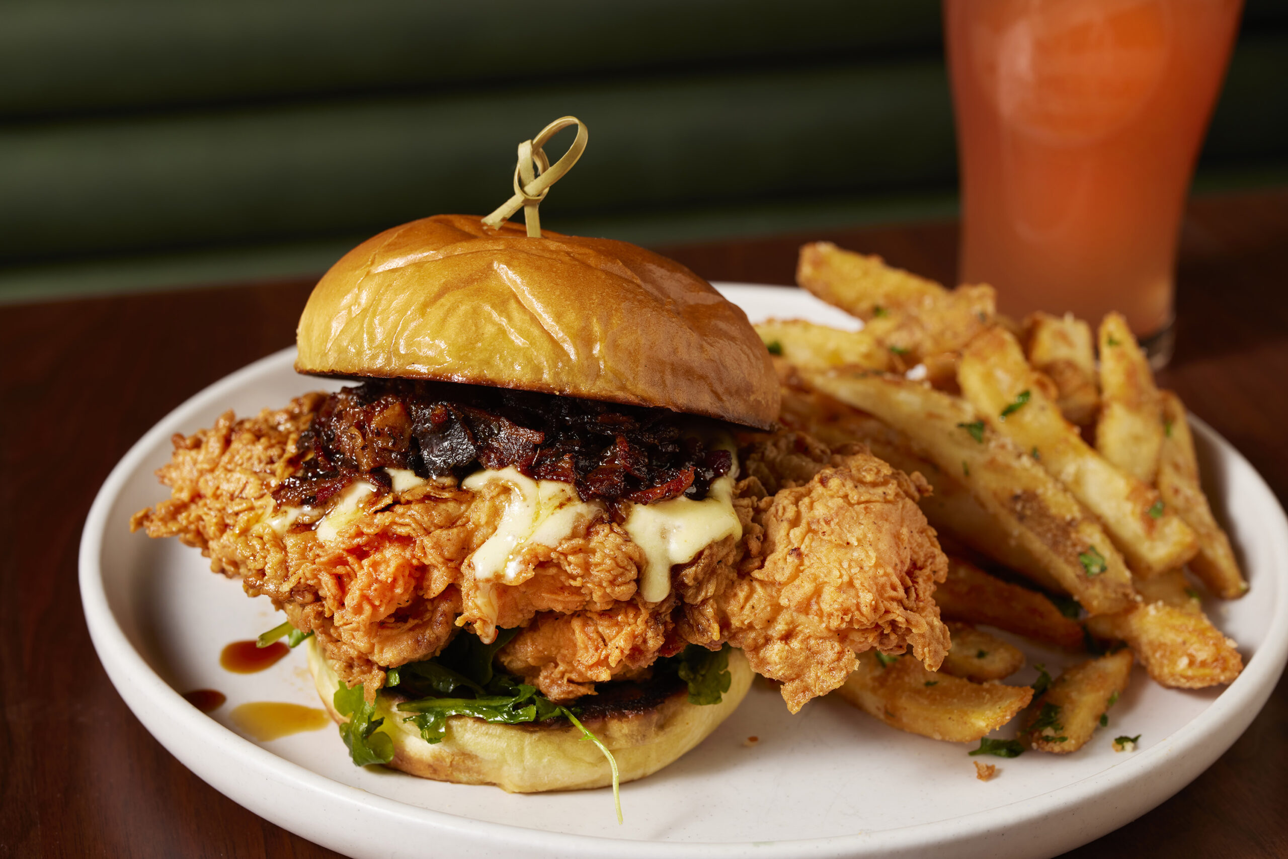 Grilled marinated Amish chicken, provolone cheese, lettuce, tomato, bacon, garlic aioli, ciabatta bread