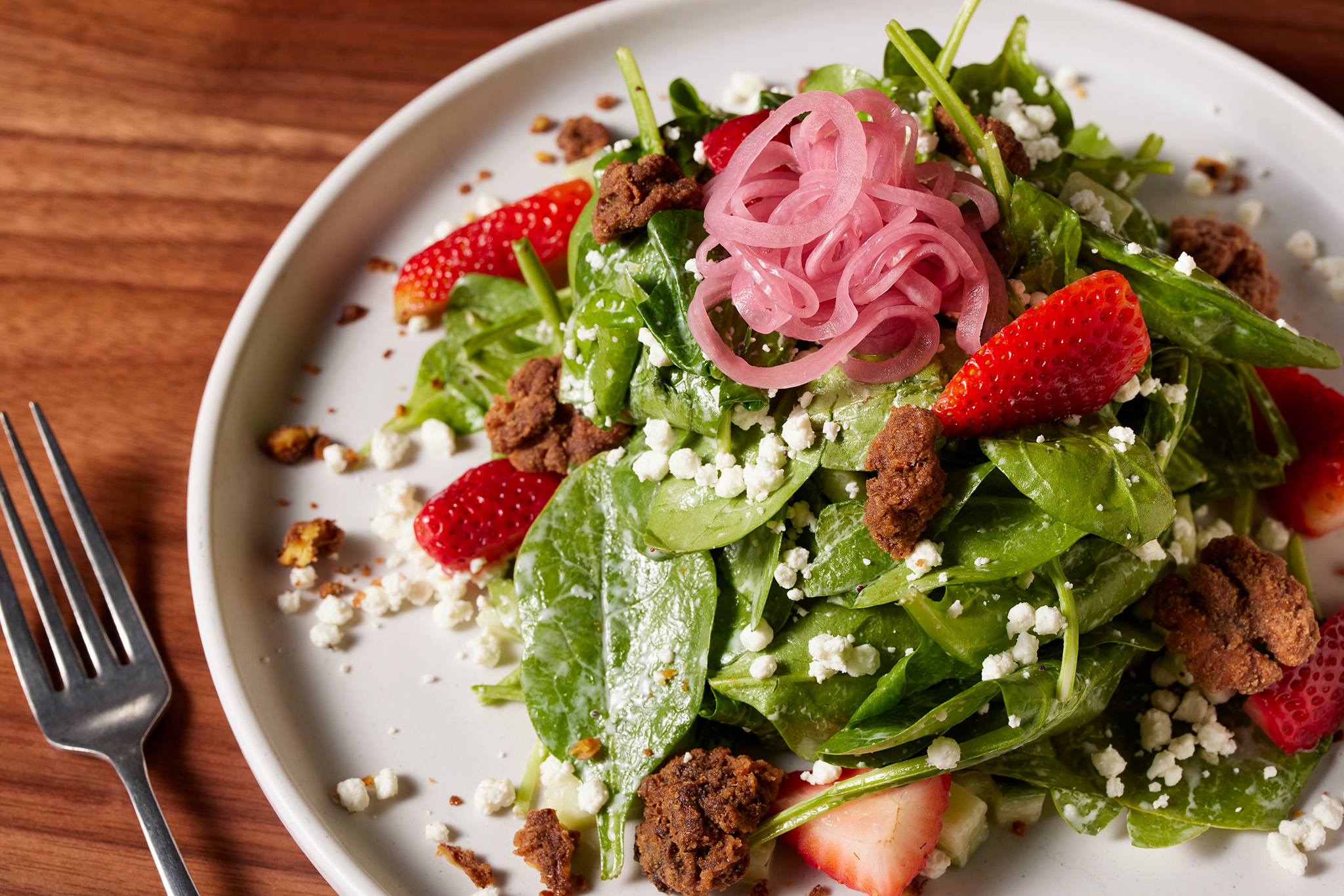 Fresh spinach, strawberries, feta cheese, candied walnuts & poppyseed dressing (V)
